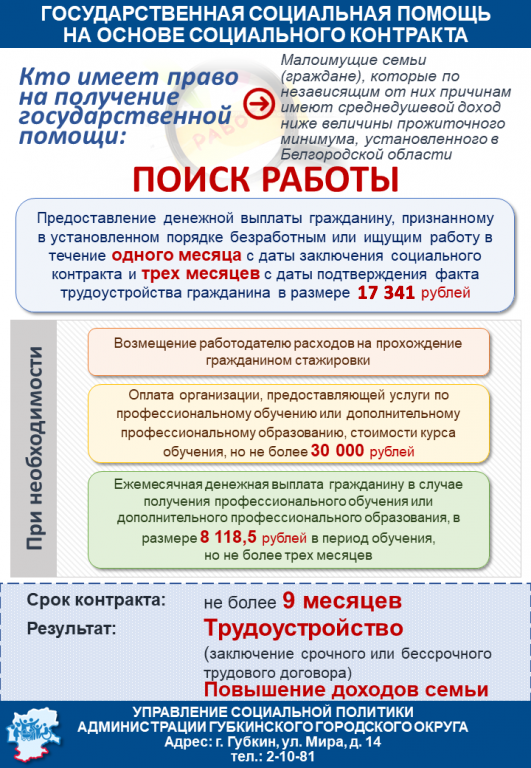 Чтобы получить помощь в рамках социального контракта, малоимущей семье или гражданину необходимо обратиться в управление социальной политики по адресу: г.Губкин, ул. Мира, д. 14, кабинет № 11 или в МФЦ.